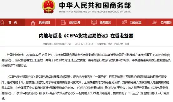 經(jīng)國務院批準,2018年12月14日上午,商務部國際貿(mào)易談判代表兼副部長傅自應與香港財政司司長陳茂波在香港簽署了《CEPA貨物貿(mào)易協(xié)議》。